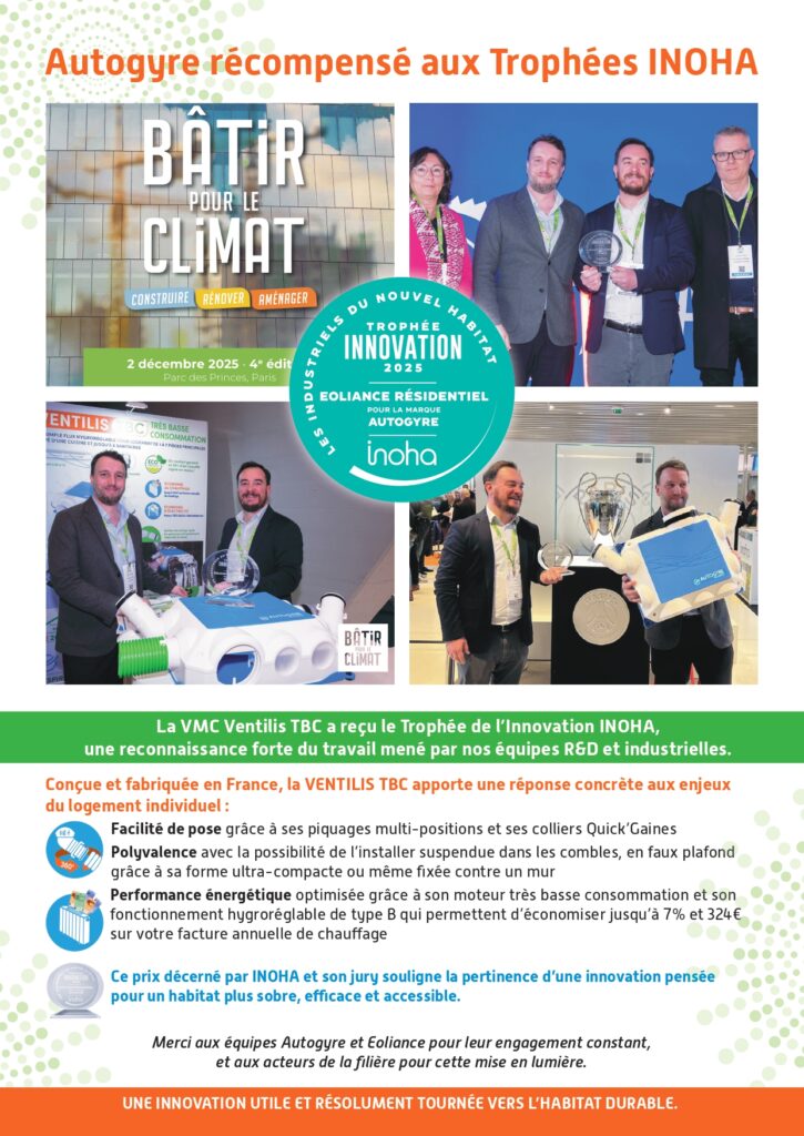 🏆 La VMC Ventilis TBC, conçue et fabriquée en France par Autogyre, a été récompensée par le Trophée de l’Innovation INOHA. Cette distinction valorise une solution de ventilation facile à installer, multi-position et ultra-compacte, pensée pour s’adapter à toutes les configurations de logement.